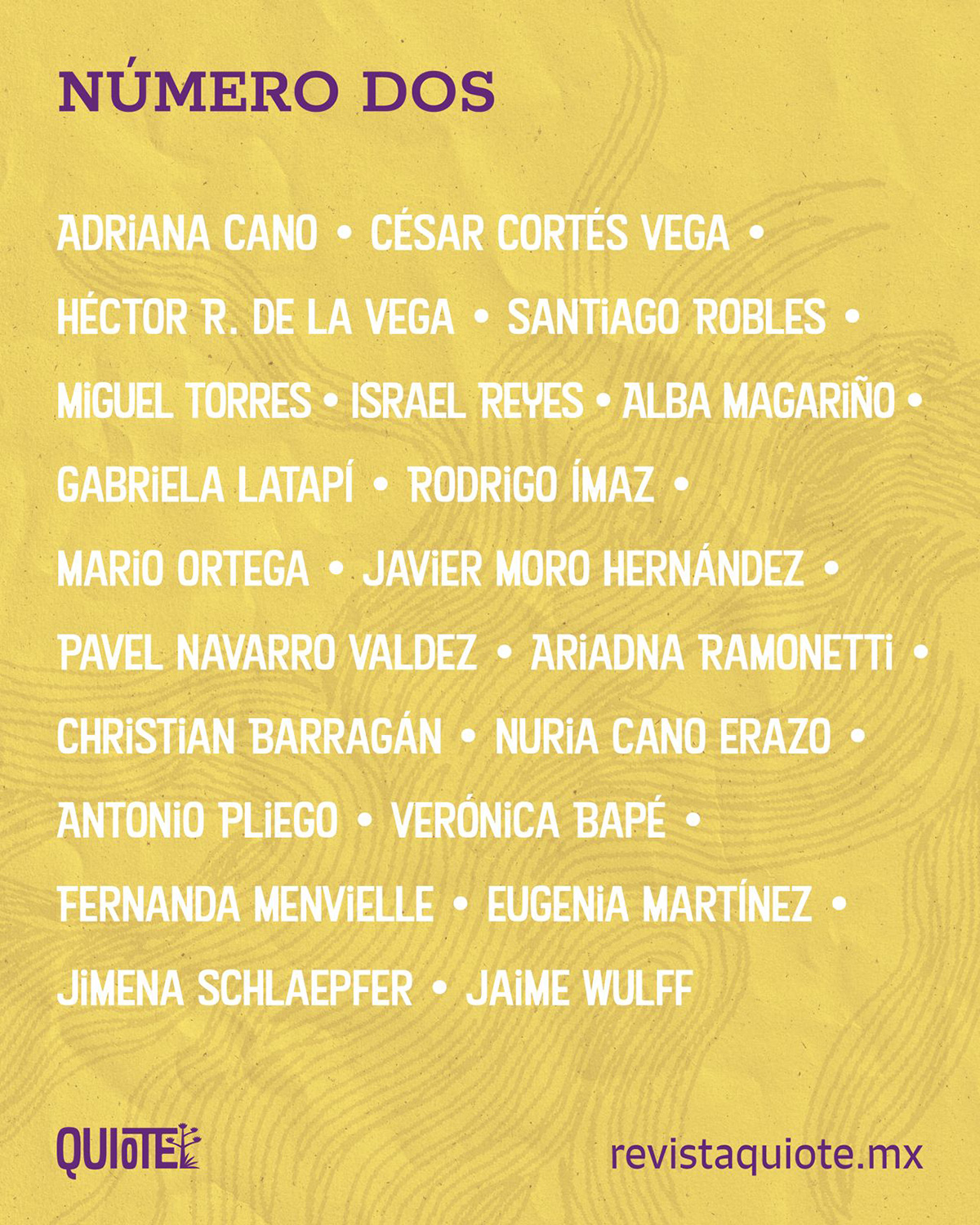 Gracias a cada una y uno de los colaboradores de este nuevo número dos de la revista Quiote: Adriana Cano, César Cortés Vega, Héctor R. de la Vega Cuéllar, Miguel Torres, Israel Reyes, Alba Magariño, Gabriela Latapi, Rodrigo Ímaz, Mario Ortega, Javier Moro Hernández, Pavel Navarro, Ariadna Ramonetti, Christian Barragán, Nuria Cano Erazo, Antonio Pliego, Verónica Bapé, Fernanda Menvielle, Eugenia Martínez, Jimena, Schlaepfer, Jaime Wulff, y a Héctor González por todo su apoyo.